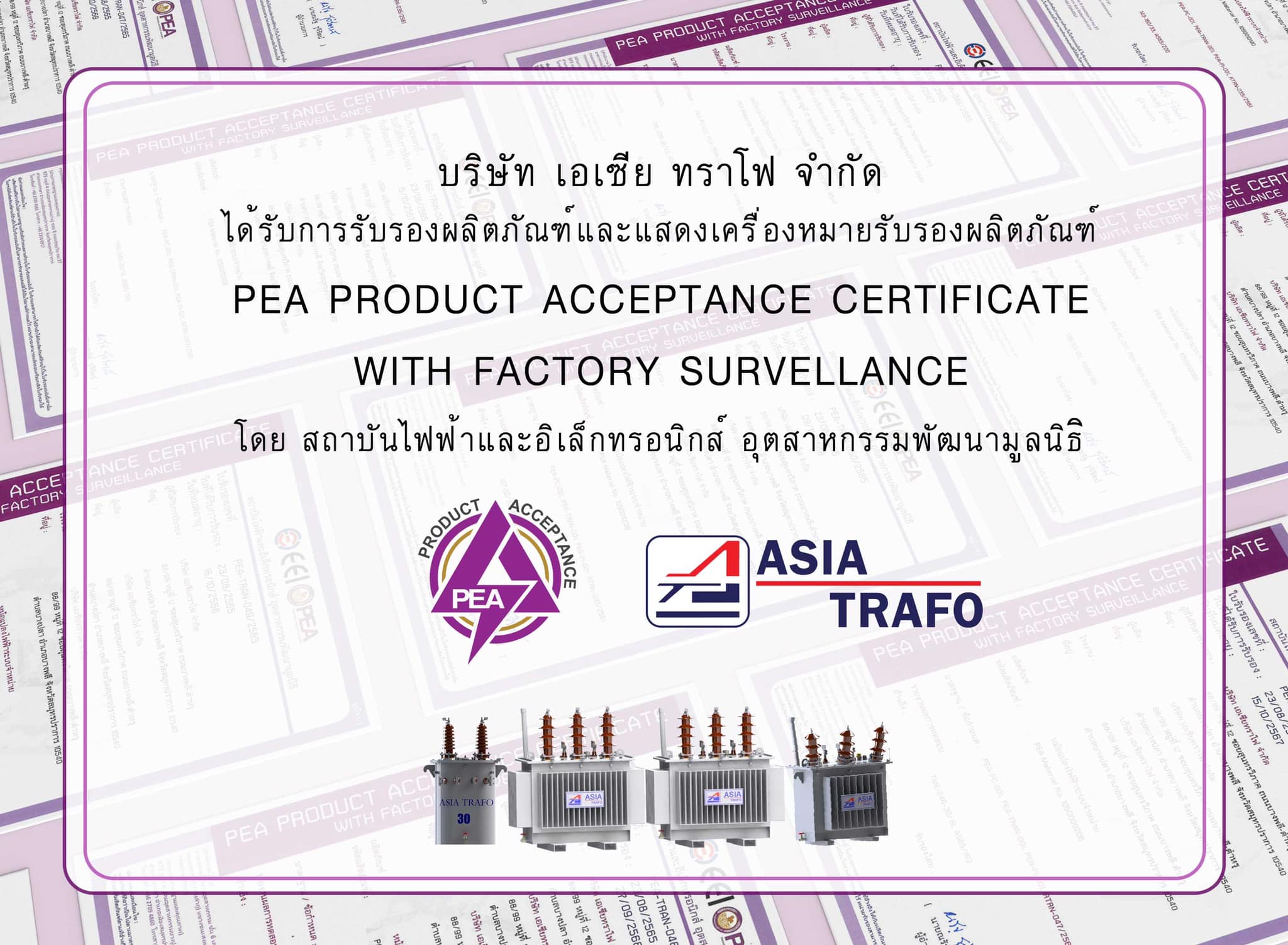 เมื่อวันที่ 23 สิงหาคม 2565 นายธีระ ศรีสุข กรรมการผู้จัดการบริษัท เอเซียทราโฟ จำกัด เข้ารับใบรับรองผลิตภัณฑ์และแสดงเครื่องหมายรับรองผลิตภัณฑ์ PEA PRODUCE ACCEPTANCE CERTIFICATW WITH FACTORY SURVELLANCE โดยได้รับเกียรติจาก นายธีระ ริมปิรังษี ผู้อำนวยการฝ่ายการมาตรฐานและคุณภาพ สถาบันไฟฟ้าและอิเล็กทรอนิกส์ เป็นผู้มอบ ใบรับรองผลิตภัณฑ์ในครั้งนี้