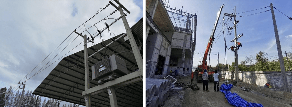 * งานติดตั้งหม้อแปลงไฟฟ้า: ติดตั้งหม้อแปลงบนเสาหรือแท่น (ตามประเภทที่ออกแบบ) และติดตั้งระบบสายดิน (Grounding System) ที่ได้มาตรฐาน